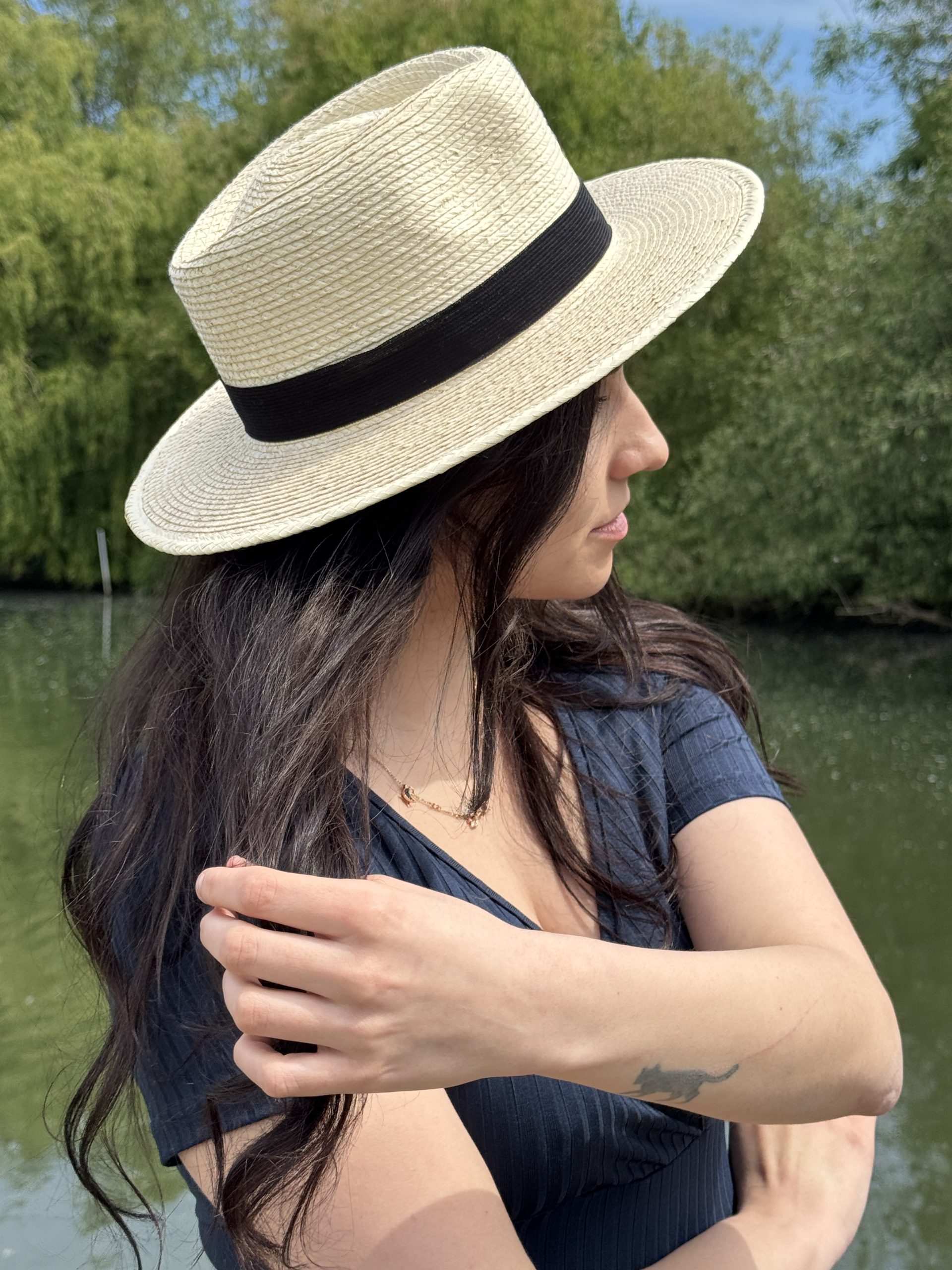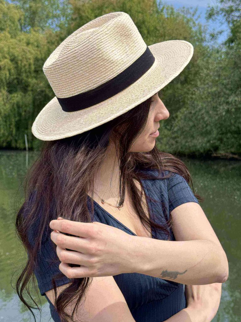 As part of its original shaping process, the blank palm hat is wetted and moulded by hand. That flexibility means you can later adjust the style of your hat – for example the sweep of the brim or the pinch of the crown – by first dampening the palm with water. (A houseplant water mister is perfect for the task!) Gently press the damp palm into the new required shape and when dry, it will permanently hold that adjustment – unless it is re-shaped once more! Do it as often as you like. Express your individuality by changing your hat to suit your personal style or even just your mood!